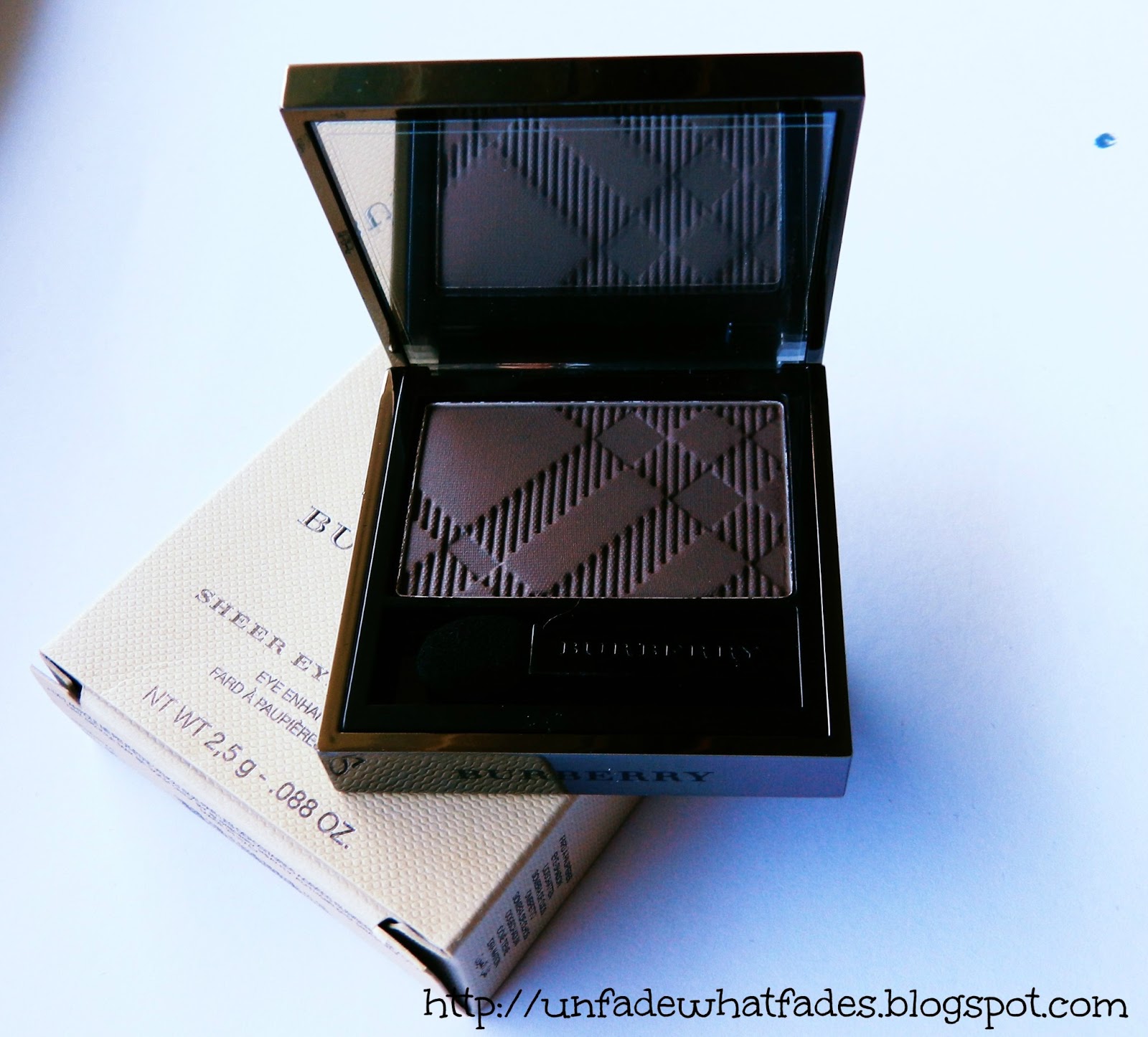 The eyeshadow itself comes in a dark pewter metal case which also bears Burberry check pattern on the lid, the same as the actual eyeshadow inside. There's also a small and useless sponge applicator.